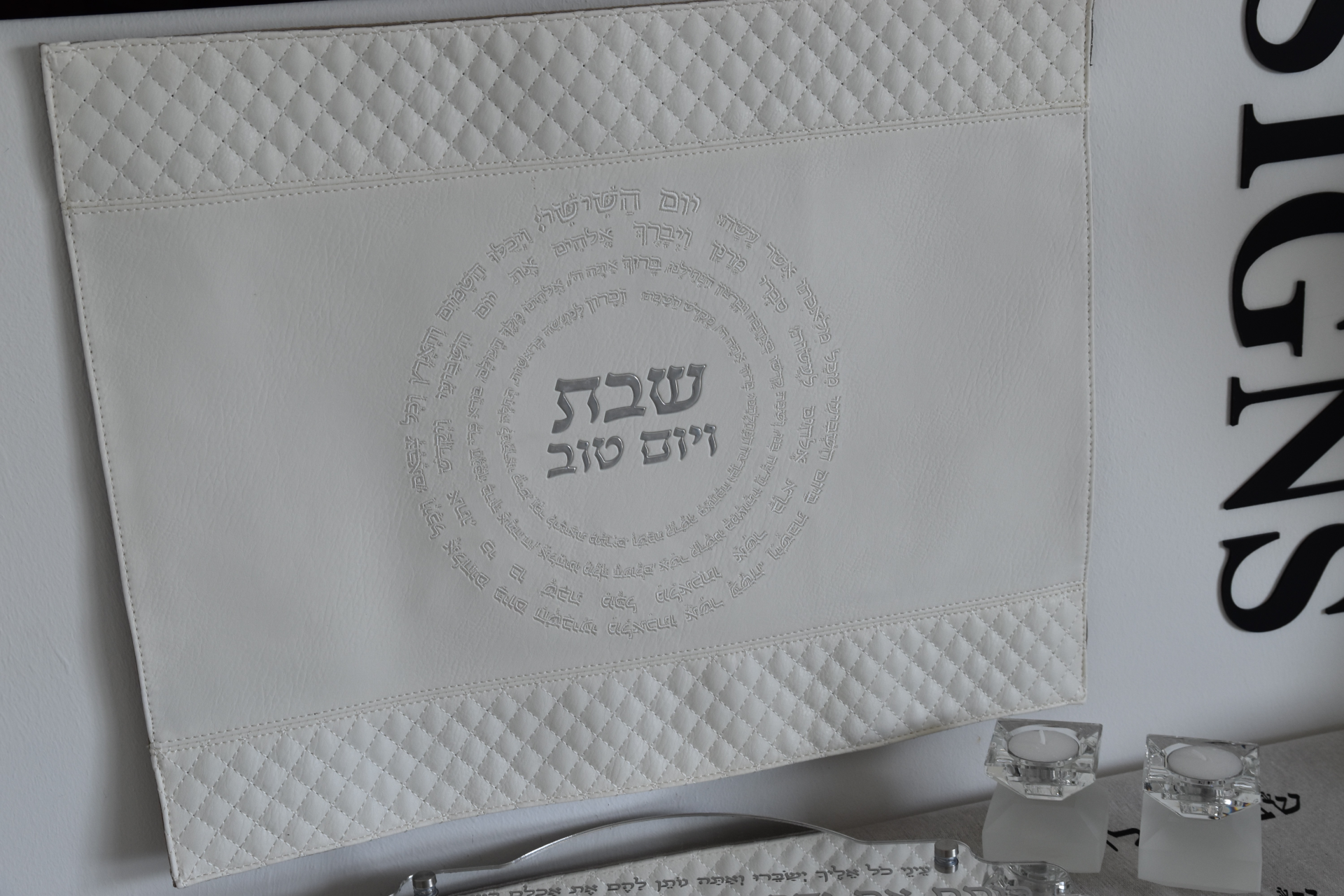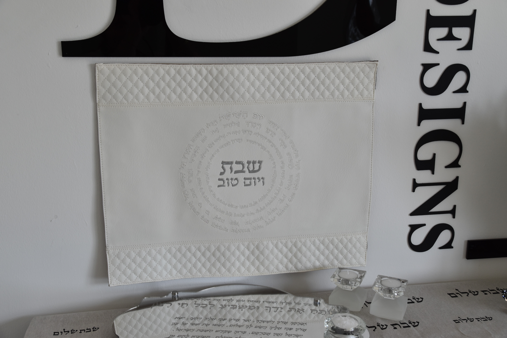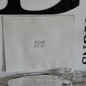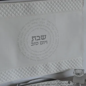 כיסוי חלה מהודר דמוי עור לבן עם הבלטה בכסף 42*52