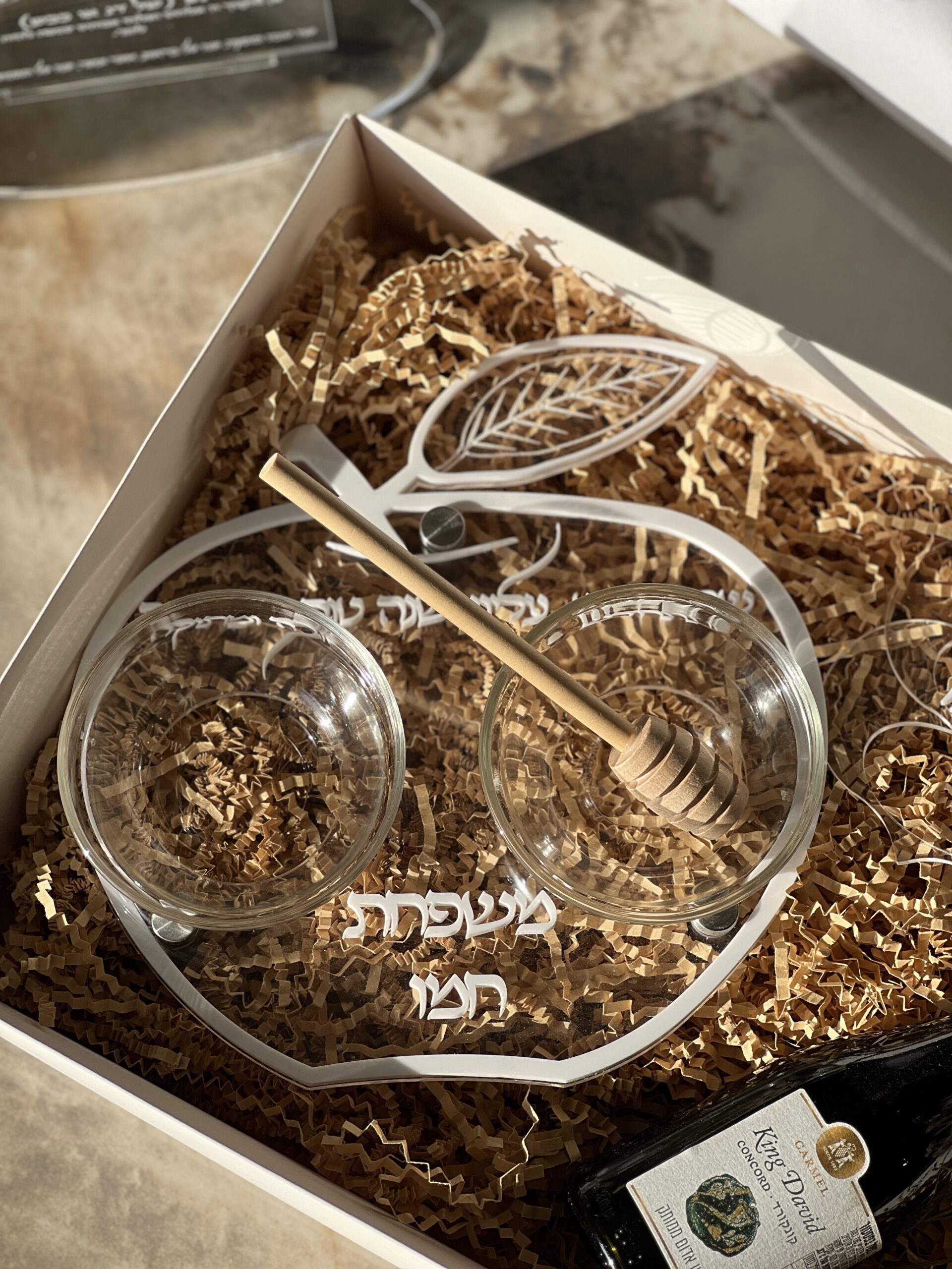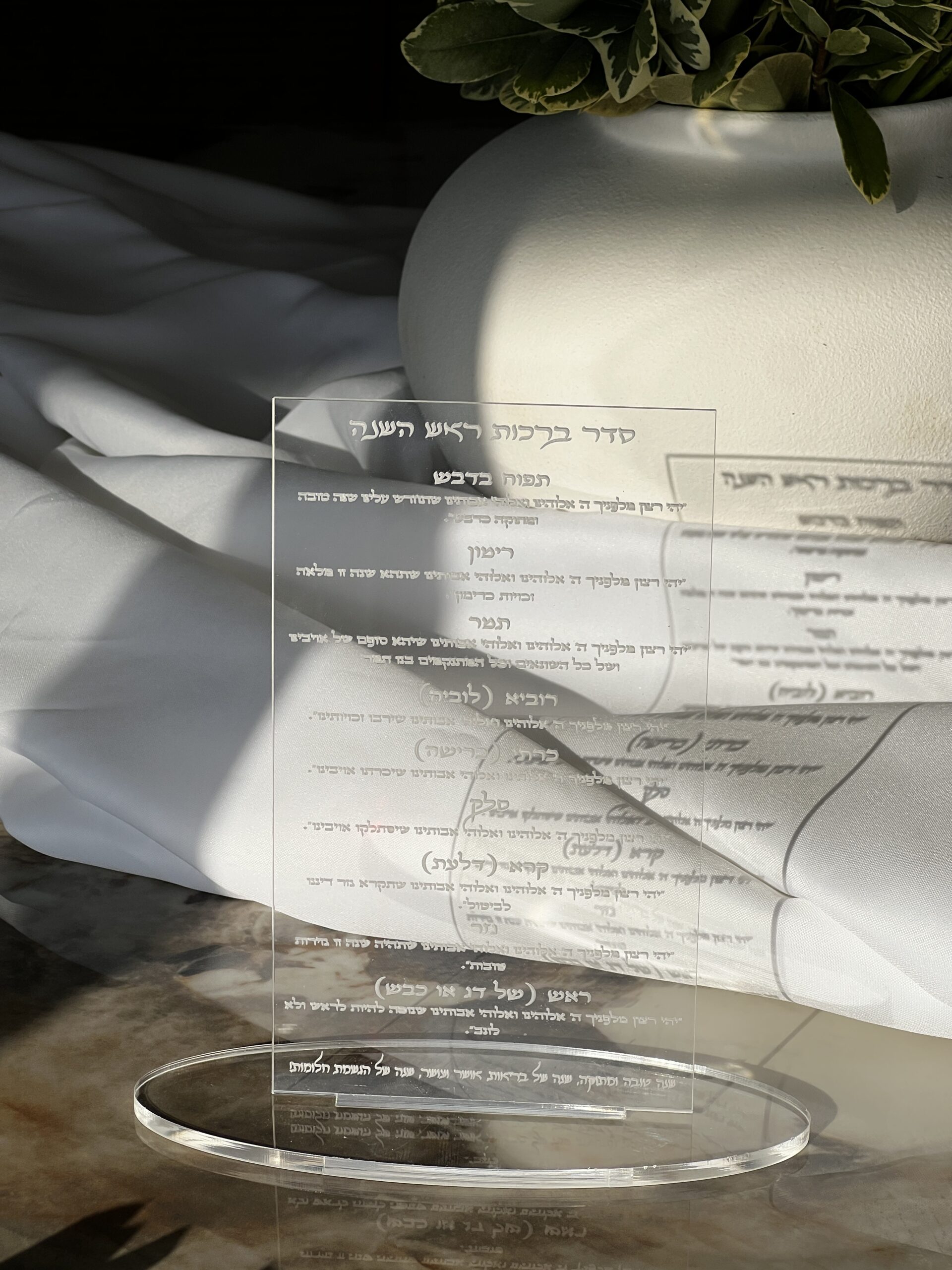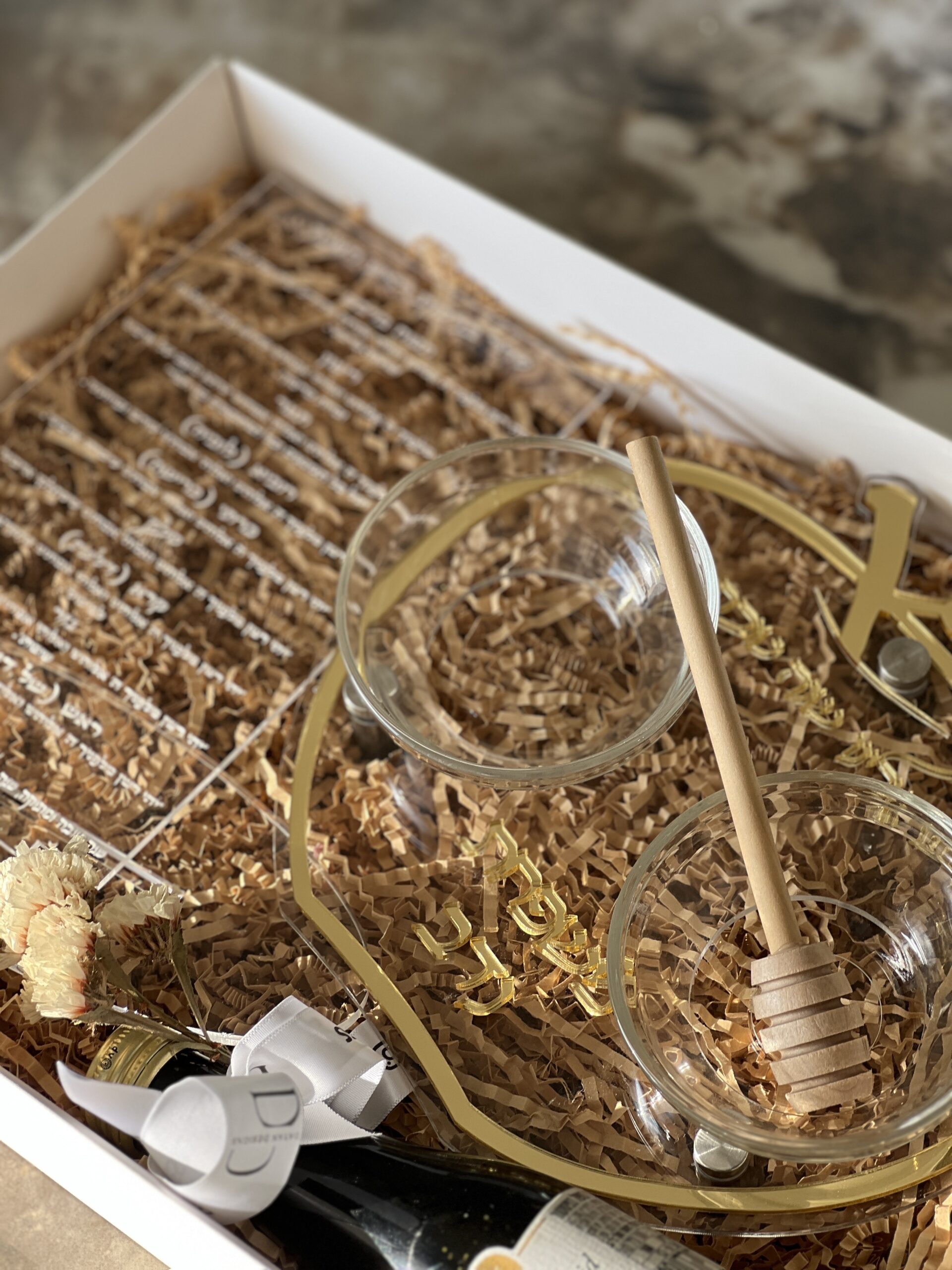 במארז יש מעמד ברכות ראש השנה אקרילי (ניתן להוסיף הקדשה).