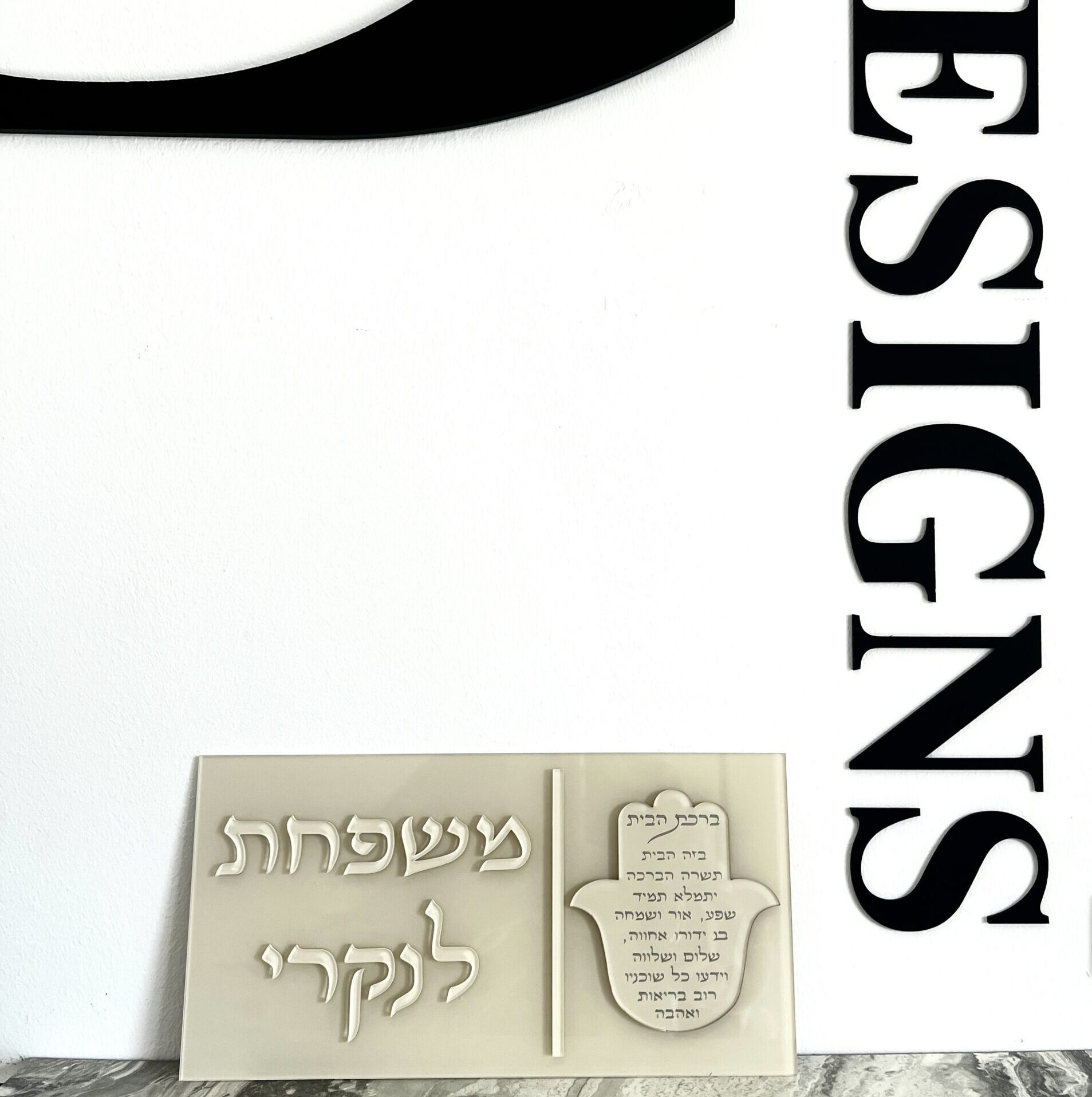 שלט מעוצב לדלת בצבע שמנת הבלטת אותיות בצבע שמנת. עם חמסה ברכת הבית.